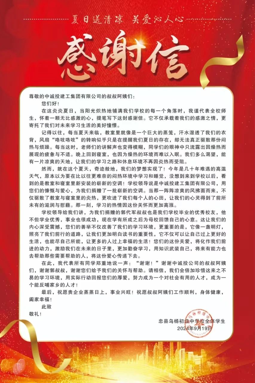 9月19日,中诚投建工集团收到一封来自重庆市忠县乌杨初级中学全体师生的感谢信。信中对集团公司及董事长郭代军慷慨解囊为学校捐赠空