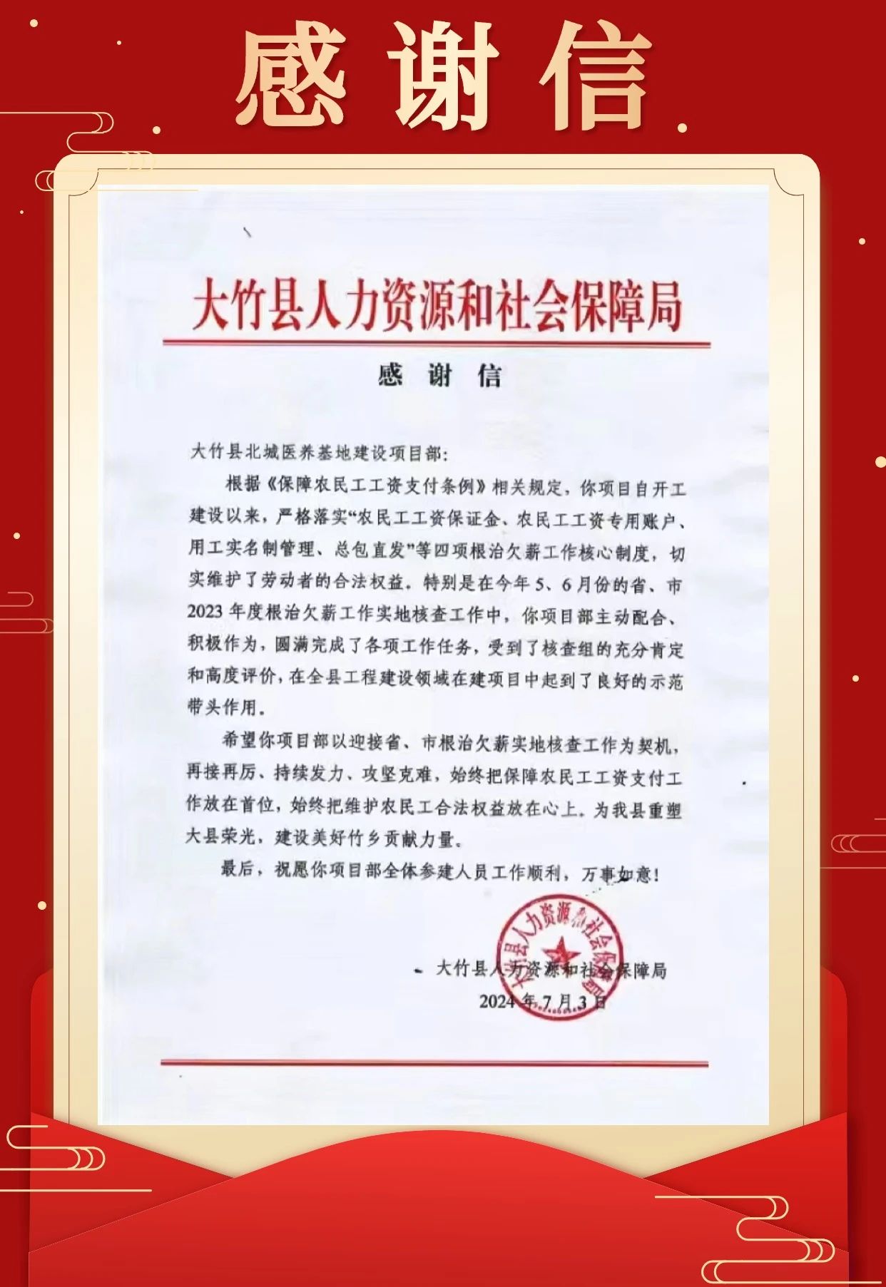 大竹县北城医养基地建设项目部收到感谢信