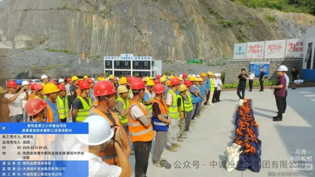 7月31日上午,紫阳县县委书记向德刚率队,带领县总工会、教体局等相关部门负责人组成的送清凉慰问组,来到中诚投建工集团承建的紫阳县第三小学项目现场,开展“夏送清凉”慰问活动