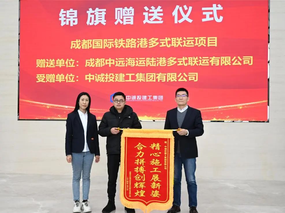 1月17日,中诚投建工集团收到成都中远海运陆港多式联运有限公司业主代表王麟送来印有精心施工展新姿 合力拼搏创辉煌的一面锦旗,