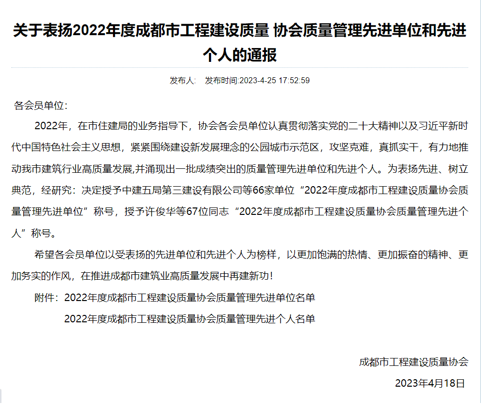 近日,成都市工程建设质量协会《关于表扬2022年度成都市工程建设质量协会质量管理先进单位和先进个人的通报》正式发布,中诚投建工集