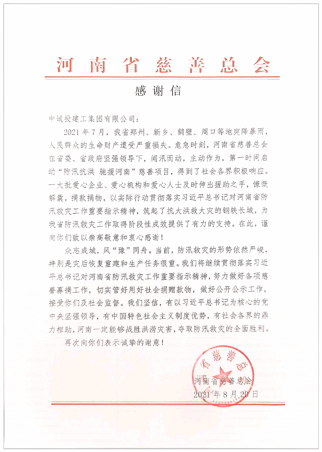 近日,河南慈善总会给中诚投建工集团发来捐赠证书及感谢信,对中诚投在防汛抗洪,驰援河南行动中,积极响应,慷慨解囊,捐款捐物,致
