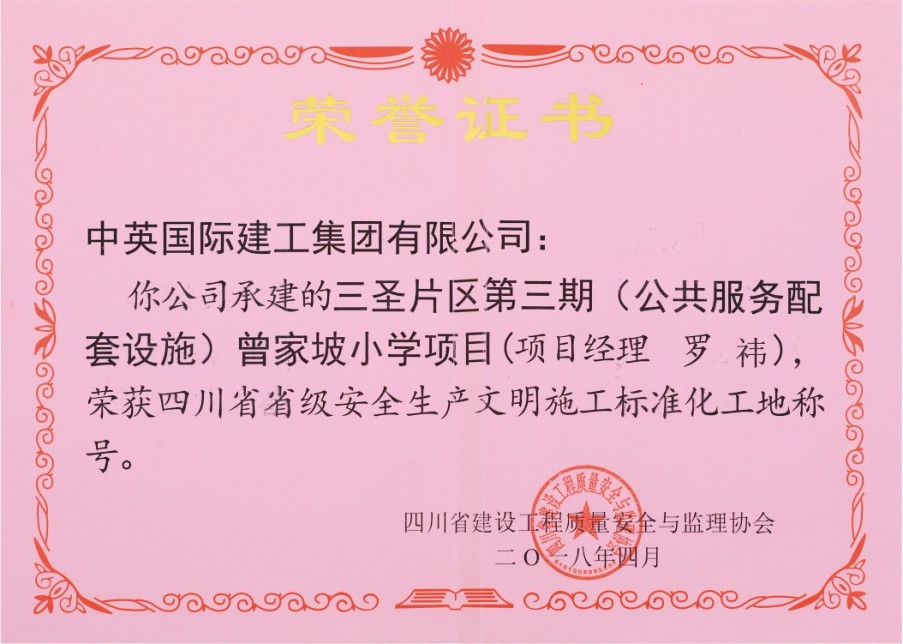 2018年四川省安全生产文明施工标准化工地(曾家坡小学)
