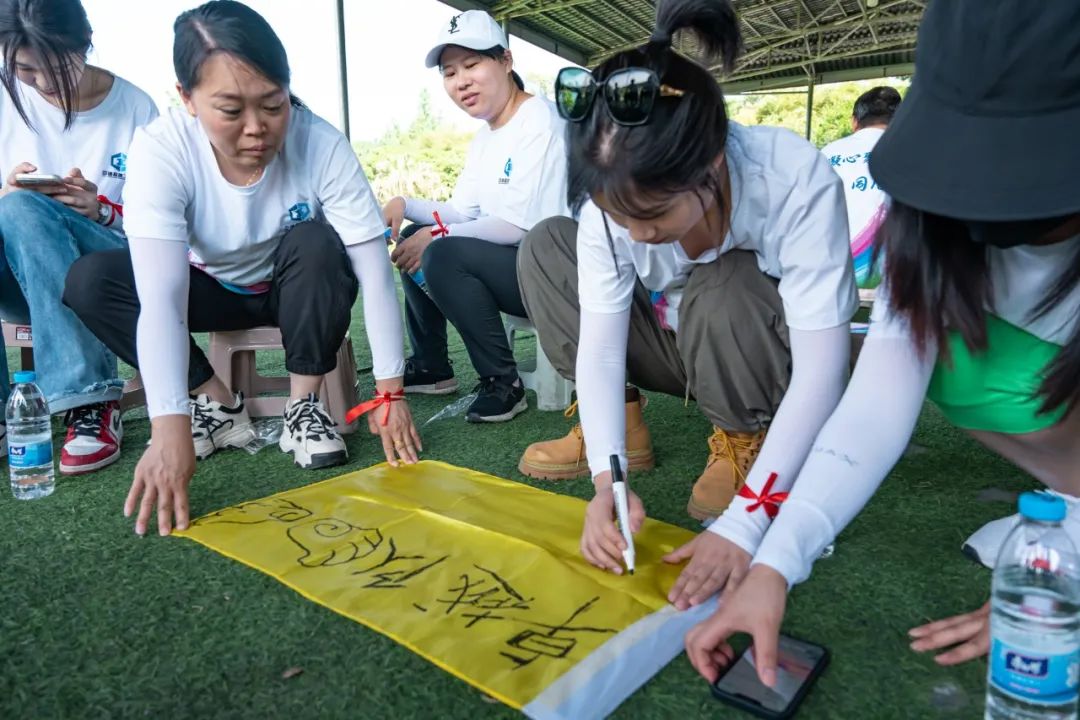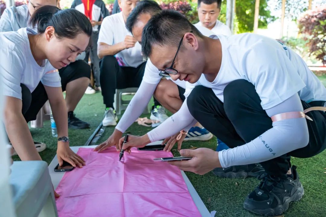 迎着朝阳,闻着花香,大家热情洋溢、激情四射。经过简单的热身活动后,在教练的指挥下,大家迅速组成8支队伍。选队长、画队旗、喊口号、唱队歌,摆队形,活动现场氛围一下子就热闹了起来。“我要飞得更高,飞得更高……”“团结就是力量……”“葫芦娃,葫芦娃,风吹雨打都不怕……”飞盘拓展项目在各队嘹亮的队歌声中拉开帷幕。