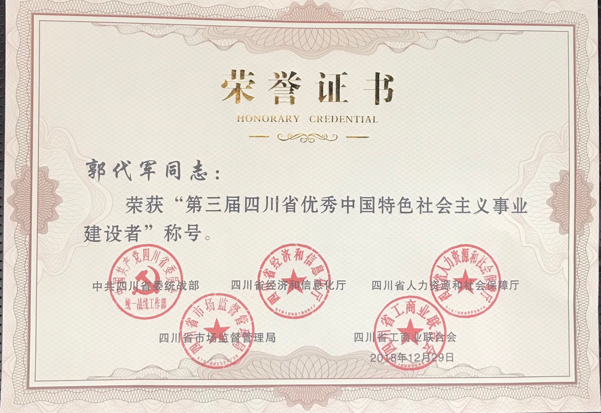 瑞雪兆丰年 岁末传喜讯,2018年12月29日第三届四川省优秀中国特色社会主义事业建设者表彰大会,暨省工商联十一届三次执委会在成都隆重召开。会上发布了表彰决定,授予100名非公有制经济人士和新的社会阶层人士“第三届四川省优秀中国特色社会主义事业建设者”称号,并颁发了奖章和证书。