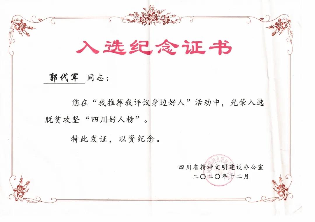 2020年是决胜全面小康、决战脱贫攻坚收官之年。为广泛宣传艰苦奋斗、真抓实干的脱贫攻坚典型事迹和感人故事,12月30日,由省文明办主办的脱贫攻坚“四川好人榜”专场发布仪式在蓉举行,现场发布了脱贫奋进、扶贫担当、爱心助贫三类“四川好人榜”共50人。集团公司董事长郭代军入选评为“爱心助贫”四川好人。