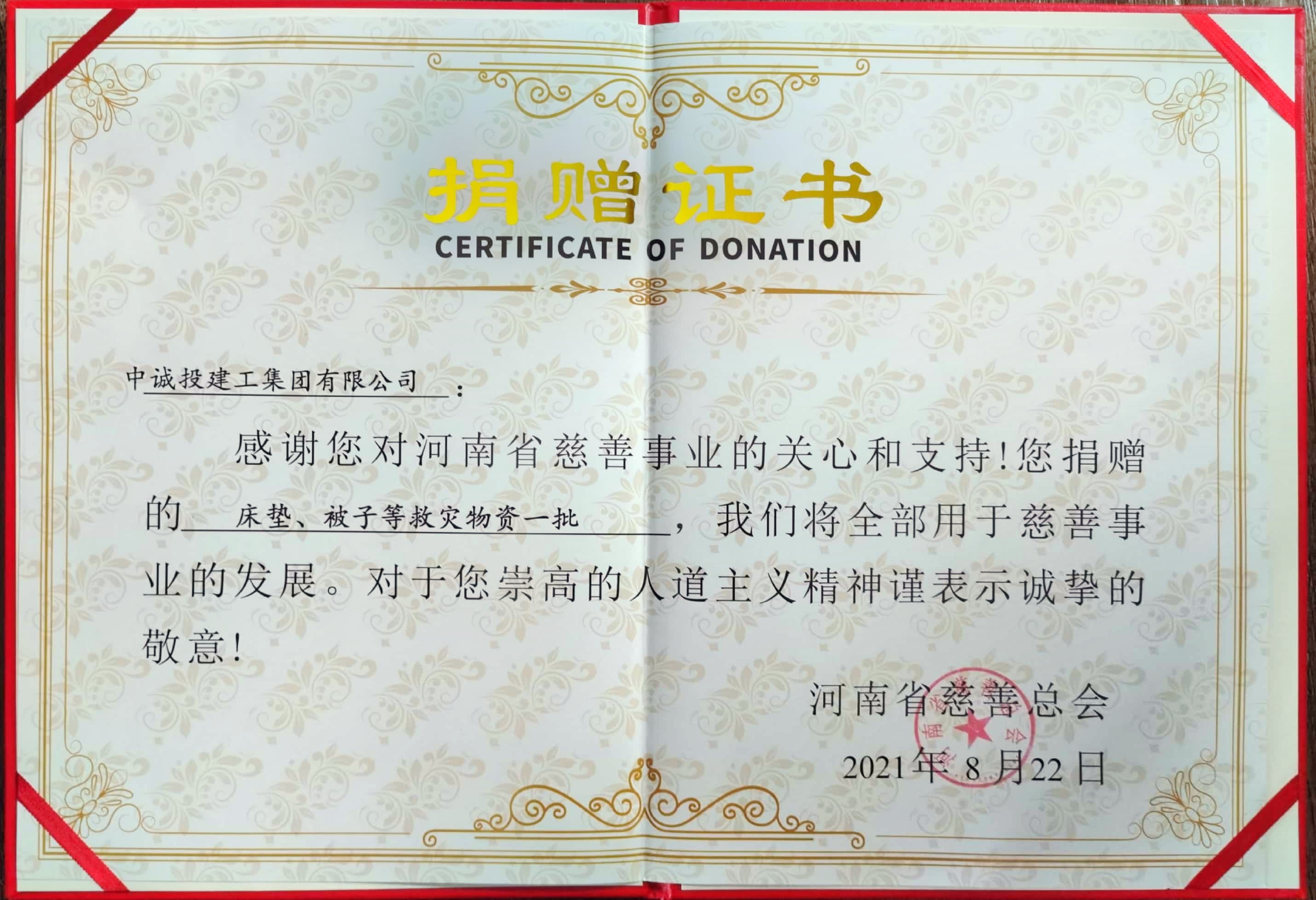 近日,河南慈善总会给中诚投建工集团发来捐赠证书及感谢信,对中诚投在“防汛抗洪,驰援河南”行动中,积极响应,慷慨解囊,捐款捐物,致以崇高敬意和衷心感谢。