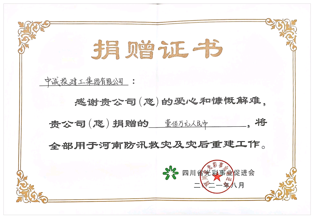 在此次“防汛抗洪,驰援河南”行动中,中诚投通过四川省光彩事业促进会向河南慈善总会捐款人民币100万元,随后直接又向河南慈善总会捐赠了一批价值400万元的床垫、凉席、被子等救灾物资,为河南省防汛救灾工作取得阶段性成效提供了有力的支持和帮助。