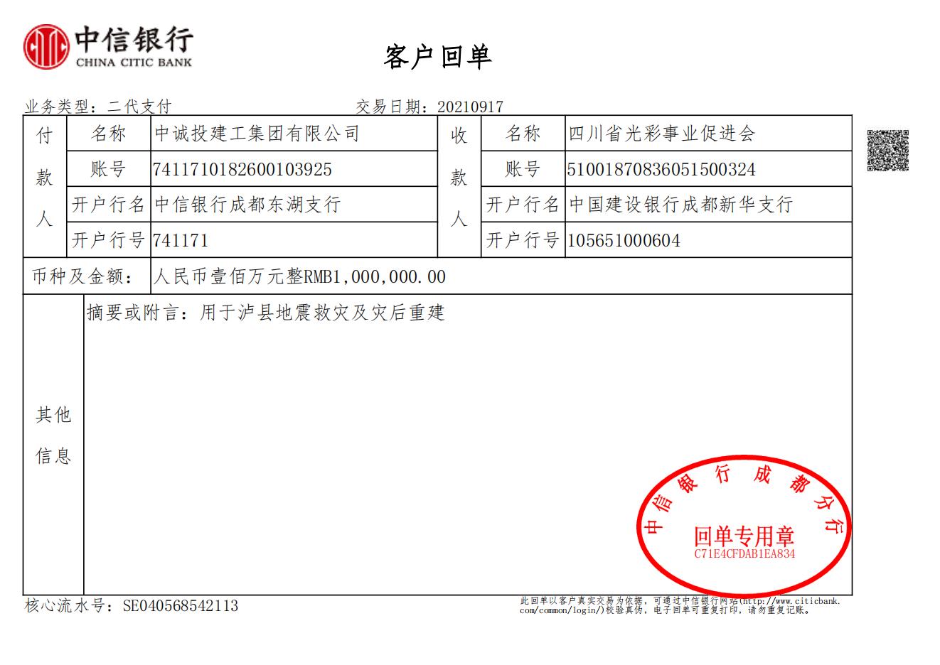 中诚投向泸县地震灾区捐款100万元,拟捐价值900元救灾物资