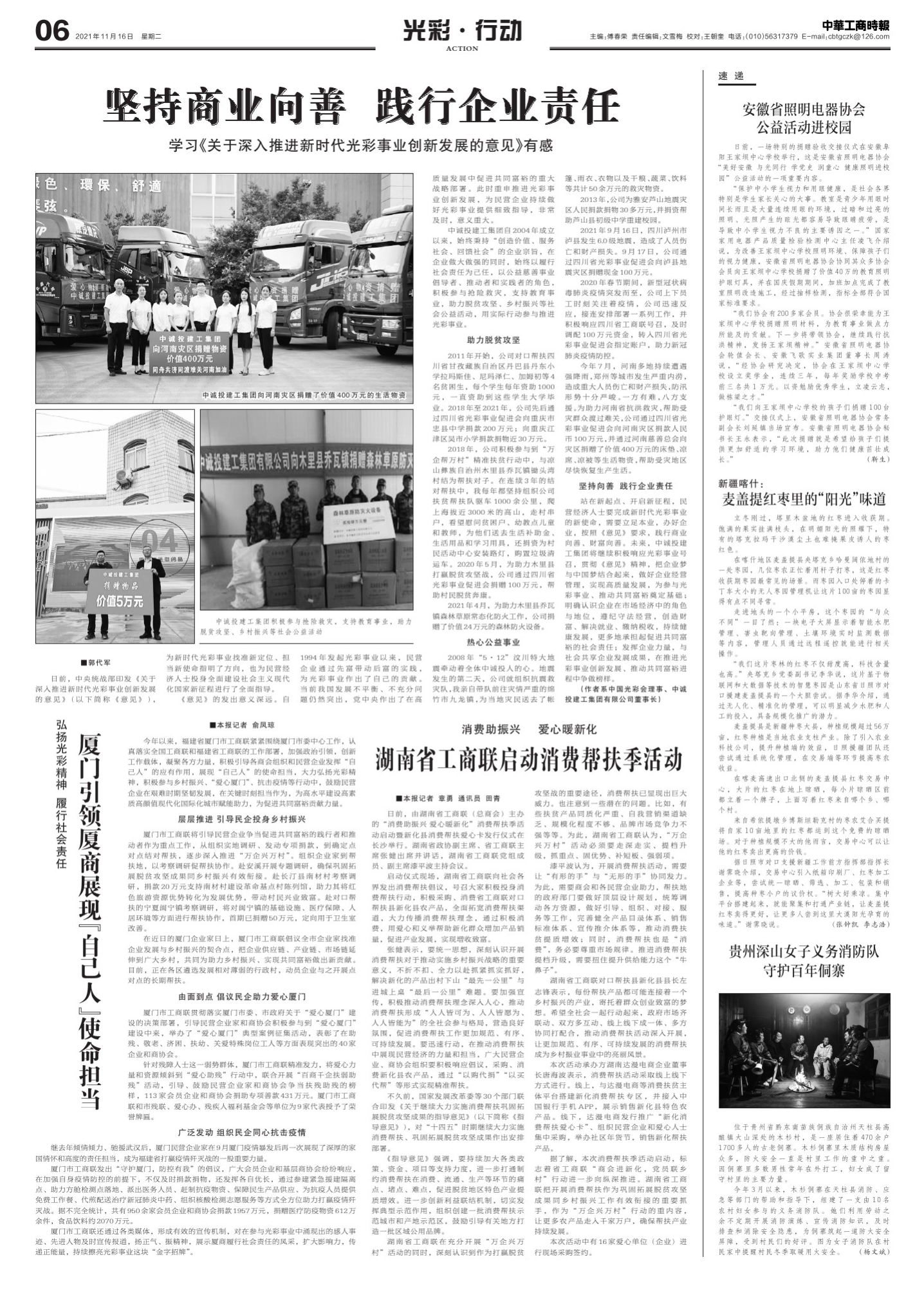 11月16日,《中华工商时报》刊登了中诚投建工集团董事长郭代军学习《关于深入推进新时代光彩事业创新发展的意见》的体会文章——《坚持商业向善 践行企业责任》。(全文附后)