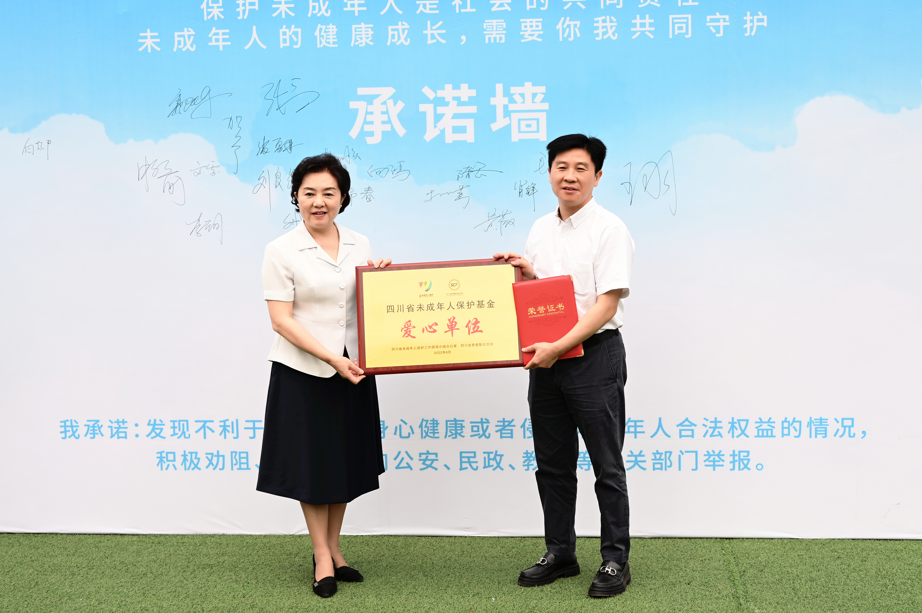 仪式前,民政厅副厅长、省未成年人保护工作领导小组办公室副主任邓为向郭董事长颁发“四川省未成年人保护基金爱心单位”荣誉证书及奖牌。