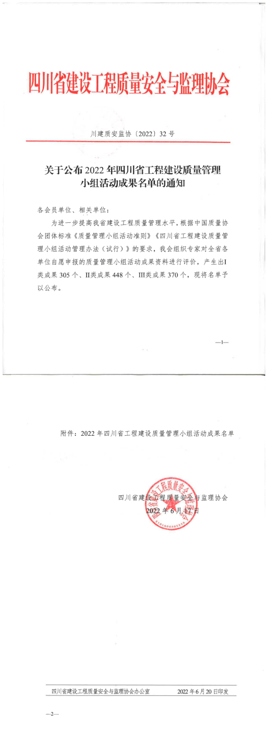 近日,四川省建设工程质量安全与监理协会公布了2022年四川省工程建设质量管理小组活动成果名单,集团公司10项QC成果荣获四川省工程建设质量管理小组活动成果奖,其中I类成果奖1项,Ⅱ类成果奖6项,Ⅲ类成果奖3项。