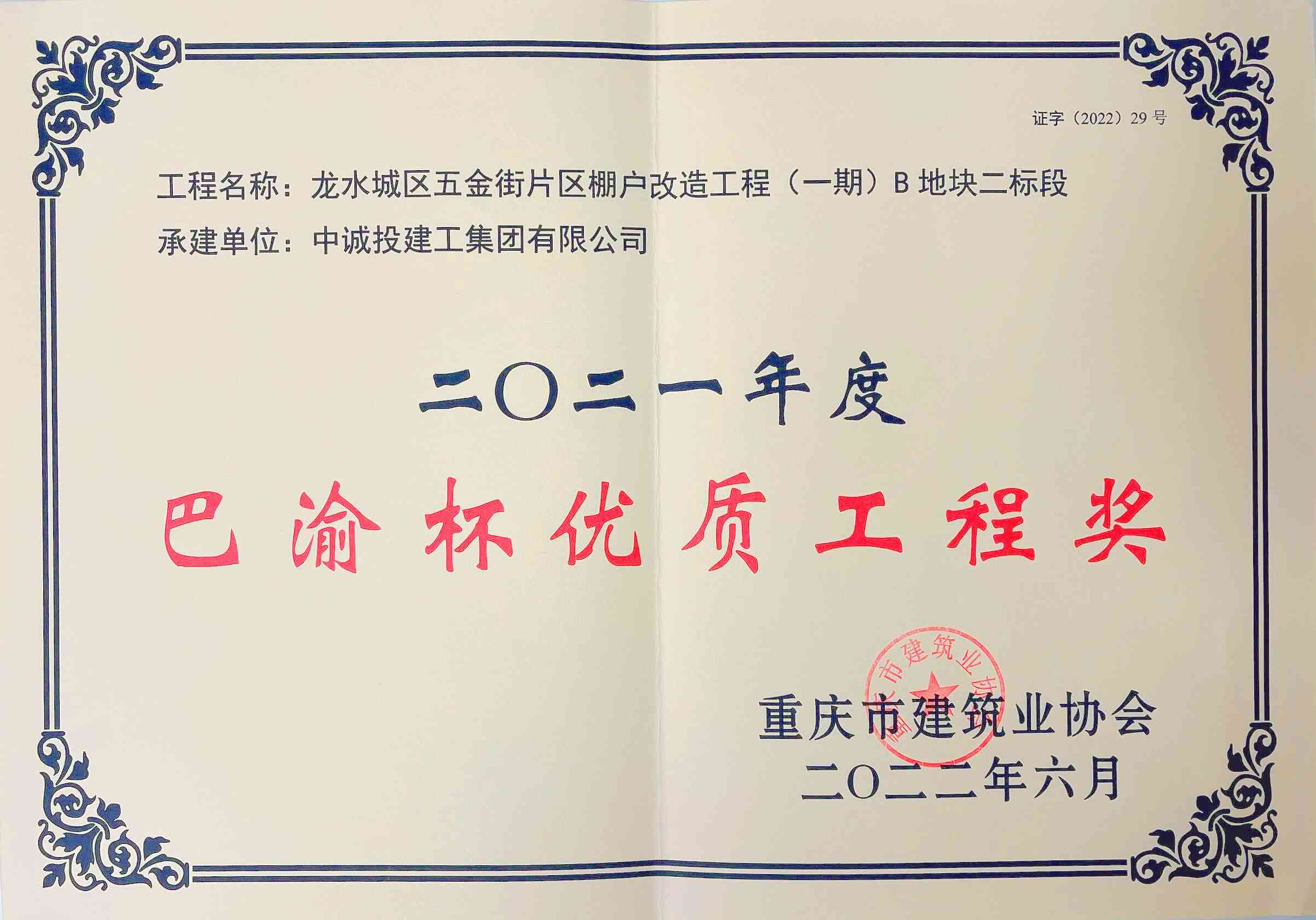 近日,2021年度重庆市建筑业协会巴渝杯优质工程奖评选结果正式揭晓,集团公司承建的龙水城区五金街片区棚户改造工程(一期)B地块二标段项目榜单有名,获此奖项。