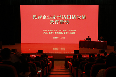 11月1日,四川省委统战部、省工商联、省光彩会在成都市新都区举行了为期1天的民营企业家世情国情党情教育活动。本次活动旨在学习宣传贯彻党的二十大精神,引导省工商联、省光彩会新一届兼职领导班子成员坚定理想信念、提升履职能力、强化使命担当,以实际行动推动全省“两个健康”事业、光彩事业再上新台阶。省委统战部副部长、省工商联党组书记唐强,省工商联主席唐燕,省工商联、省光彩会新一届领导班子成员,省委统战部二级巡视员李明全及有关处室负责人,省工商联机关干部共近100人参加了活动。