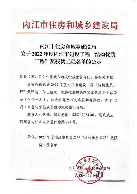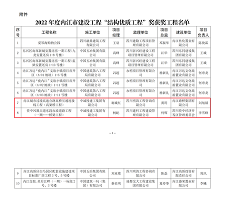 近期,内江市住房和城乡建设局公布了2022年度内江市建设工程“结构优质工程”奖获奖工程名单,中诚投建工集团承建的内江城市过境高速公路高桥互通连接线工程项目和资中凤凰大道东段市政道路工程项目榜上有名。