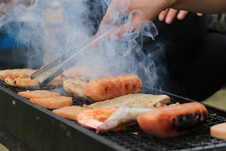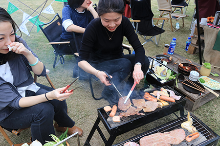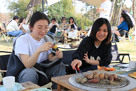 傍晚时分,女职工们围坐在烤炉旁,个个变身为“大厨”,翻动着烤肉,挥洒着调料,分工协作,气氛其乐融融。烟熏炙烤出的浓郁香气瞬间勾起食欲,蘸满佐料的烤肉诱人胃口大开,大家尽情享受着美食带来的快乐。
