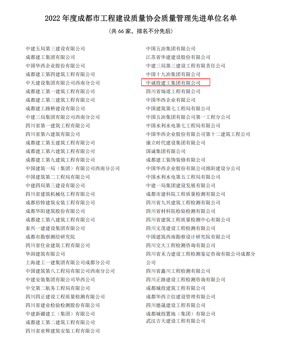 近日,成都市工程建设质量协会《关于表扬2022年度成都市工程建设质量协会质量管理先进单位和先进个人的通报》正式发布,中诚投建工集团获评2022年度成都市工程建设质量协会质量管理先进单位,标志着集团公司质量管理又迈上新台阶。