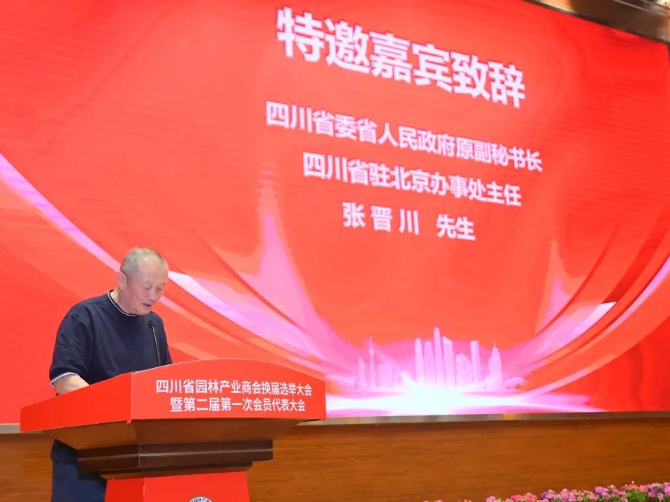 原四川省人民政府副秘书长、省政府驻北京办事处主任张晋川作为特邀嘉宾代表讲话。他向本次大会的顺利召开表示热烈祝贺,并对中诚投建工集团董事长郭代军当选第二届会长给予诚挚的祝贺。他指出,园林产业的实质就是绿色产业,绿色是新时代发展的亮丽底色。要发展出中国特色示范现代化风景园林,需进一步强化生态优先,绿色发展的战略定力,其要久久为功,护好绿水青山,做大金山银山,让绿水青山真正成为托起城市绿色高质量发展和区域产业的重要支撑。
