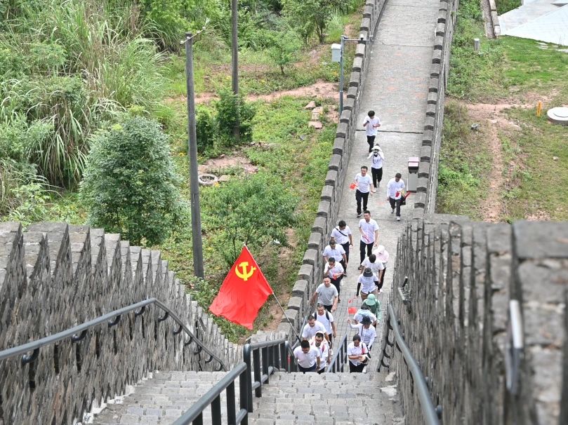 骄阳似火,却抵挡不住大家追寻长城精神的脚步。下午3点,全体人员在金龙长城脚下集结,个个精神抖擞、不畏酷暑、不惧艰难,整装待发。“让我们拿出红军长征二万五千里的精神,攀长城,登高峰,在心手相依中学习百年党史,铭记革命精神!”随着党委书记张阜文的一声令下,大家士气高昂,迈着整齐步伐,向着长城进发。
