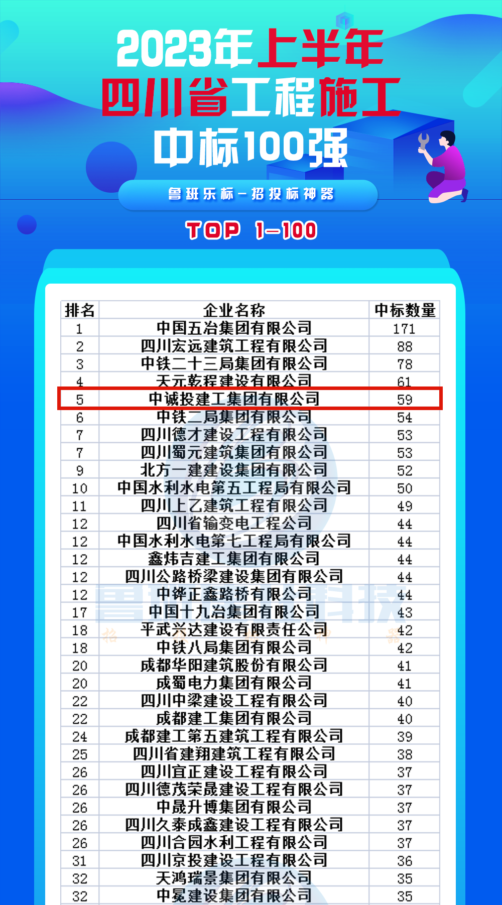 近日,2023年上半年四川省工程施工、监理、勘察设计中标100强企业名单火热出炉。中诚投建工集团以优秀的业绩荣登“2023年上半年四川省工程施工中标100强”榜单第5名。