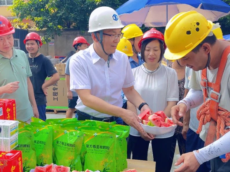 活动中,各慰问小组分别来到华府片区、西部新城、江安河、金康花园、南村公寓、三利广场、综保区文化长廊及崇州市城市污水处理厂等成都市内及周边在建工程项目,为施工一线的员工送去了西瓜、藿香正气液、板蓝根颗粒、凉茶、洗护用品等防暑降温物资。同时,各小组深入施工现场询问了解一线员工工作、生活情况,对他们不畏高温酷暑、坚守岗位、甘于奉献的劳动精神表示衷心的感谢,并鼓励大家继续发扬拼的精神、闯的干劲,弘扬工匠精神,在有序推进项目建设的同时,时刻注意防暑降温,提高安全生产意识,确保平安度夏。