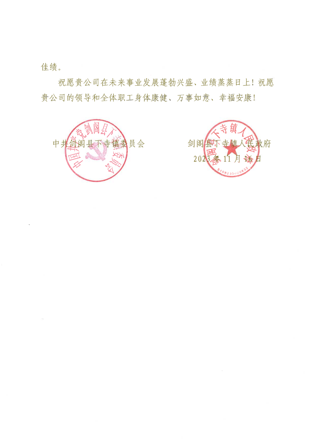信中,下寺镇人民政府向中诚投为当地城市建设与经济社会高质量发展作出的重要贡献致以深深的感谢,并表示将继续全力支持中诚投在下寺镇的项目建设与发展,共同打造更好、更强、宜居、宜业县城。