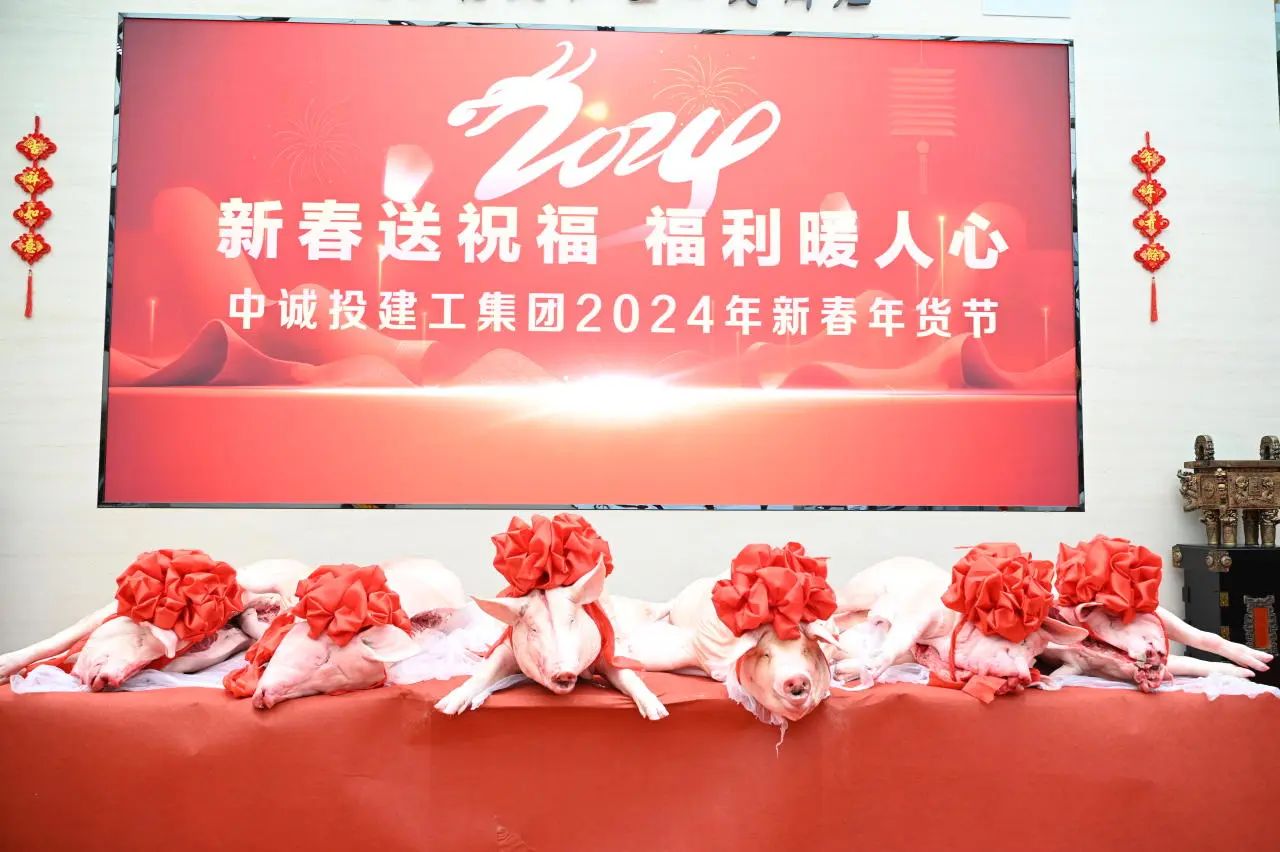 2月6日上午,中诚投建工集团在总部大楼举行“2024年新春年货节”,为员工发放猪肉、苹果、大米、菜籽油等年货。