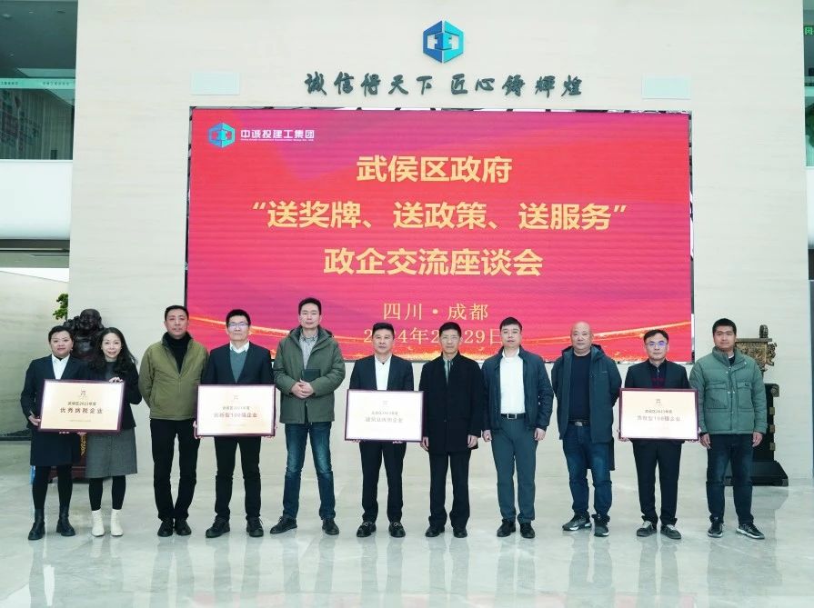 会后,调研组领导分别为中诚投颁发了武侯区2023年度“建筑业优势企业”“创新型100强企业”“贡献型100强企业”“优秀纳税企业”四项荣誉奖牌。
