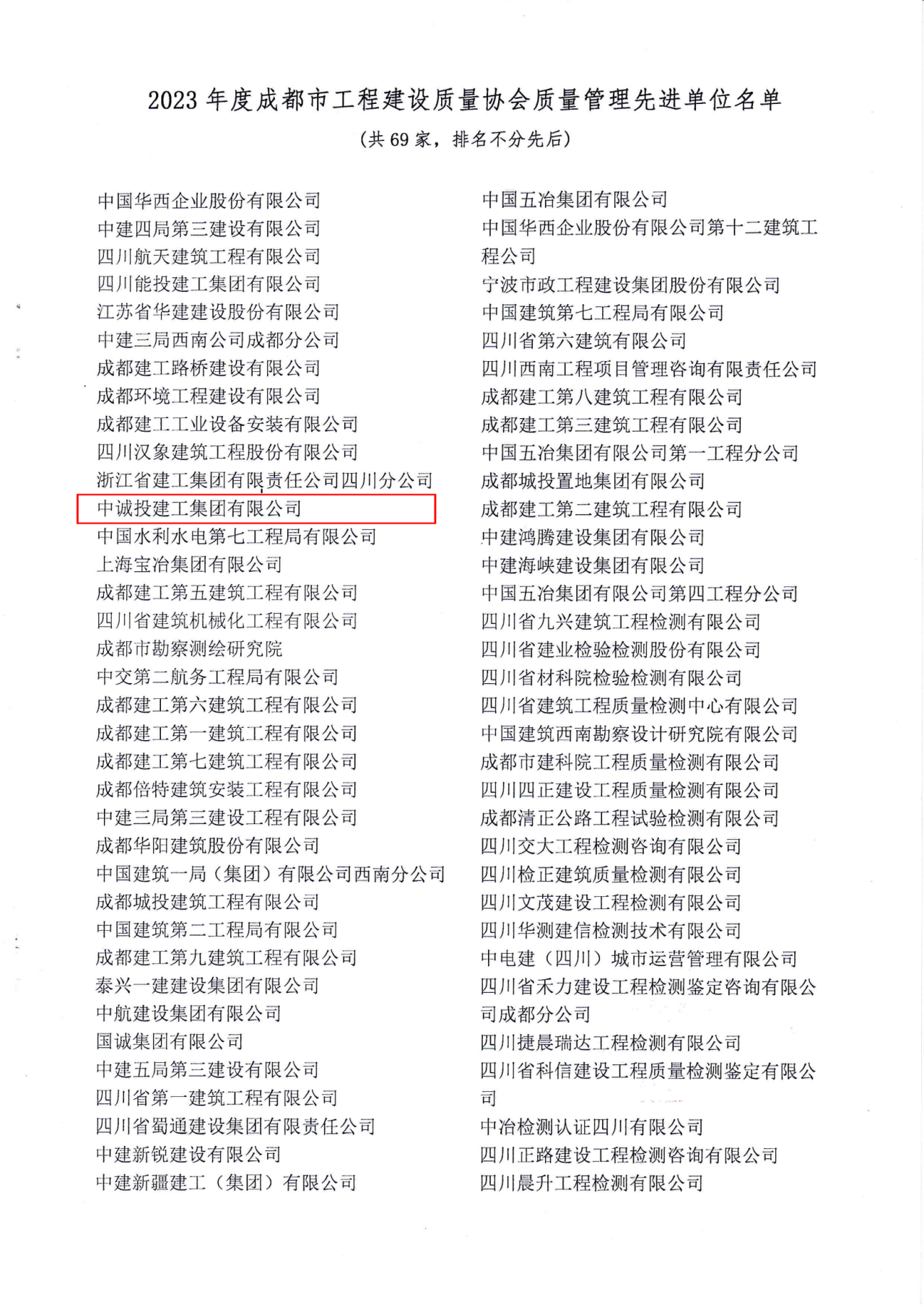 近日,成都市工程建设质量协会正式发布2023年度“质量管理先进单位”名单,中诚投建工集团名列其中,被授予“质量管理先进单位”称号。