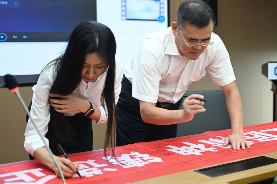 活动前,参加“质量月”启动会人员纷纷在主题横幅上签名,表达对活动的支持和对质量管理的坚定决心。