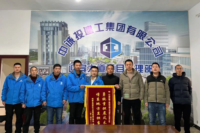 近日,成都东部新区石板凳街道办事处将一面绣有 “情系地方显担当 勇挑重担展风采” 的锦旗郑重送至中诚投建工集团迎宾大道项目部,以表彰项目部在当地基础设施改善、社区文化建设及公益事业推进中所作出的贡献。路桥公司总经理张德斌代表集团公司接受锦旗,并参加座谈交流。